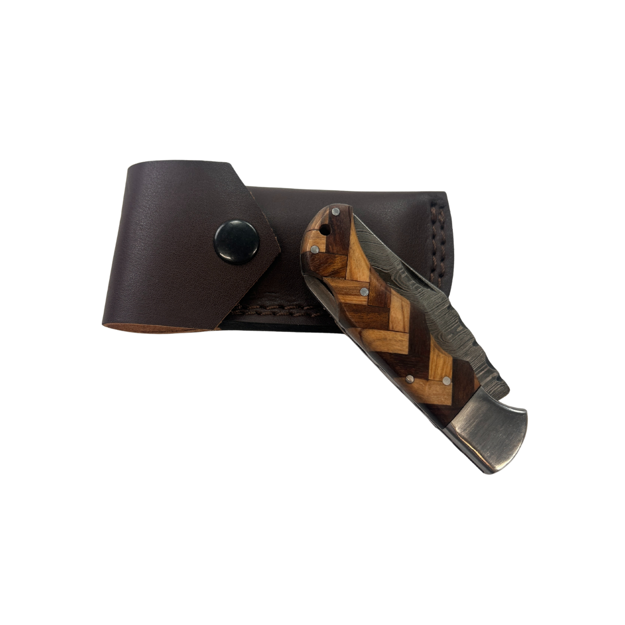 The Lifespace Damascus Steel Folding Knife combines refined craftsmanship with practical design in a compact, elegant form. The blade is forged from high-quality Damascus steel, showcasing distinctive natural patterning that makes each knife unique. A beautifully finished rose and olive wood handle provides a warm, comfortable grip, complemented by a durable steel bolster for added strength and balance. Measuring 2.95 inches for the blade and 3.74 inches for the handle, this folding knife offers a total length of 6.69 inches when open—ideal for everyday utility and collection alike. Precision construction ensures smooth folding action and reliable performance. A leather pouch is included for safe storage and convenient carry.