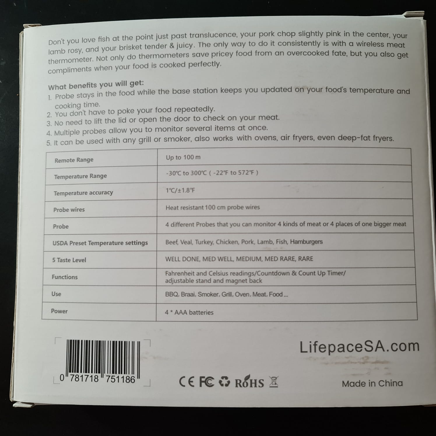 Cook with confidence and precision using the Lifespace Wireless Meat Thermometer. Perfect for grilling, smoking, and more!