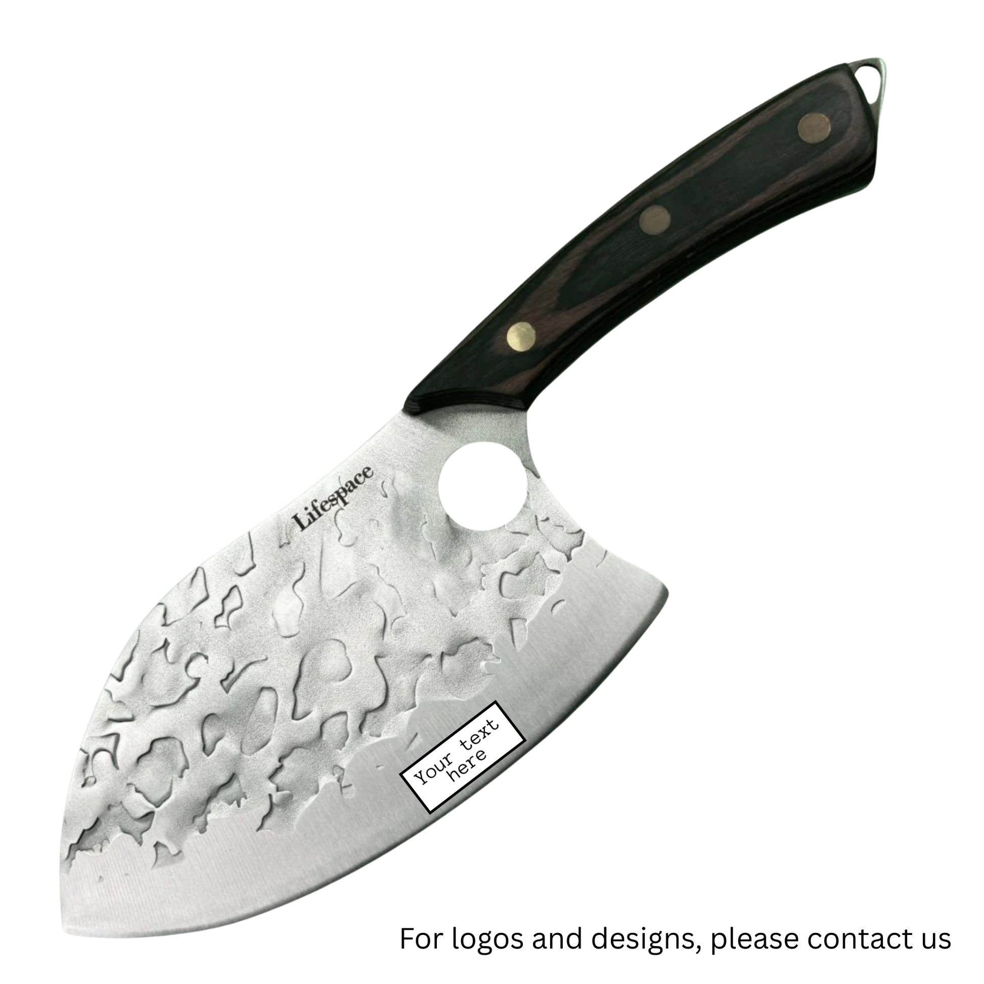 Introducing the Lifespace 7" Peach Hammered Braai Cleaver with a Hole, the ultimate tool for mastering your braai and kitchen tasks with precision and style.