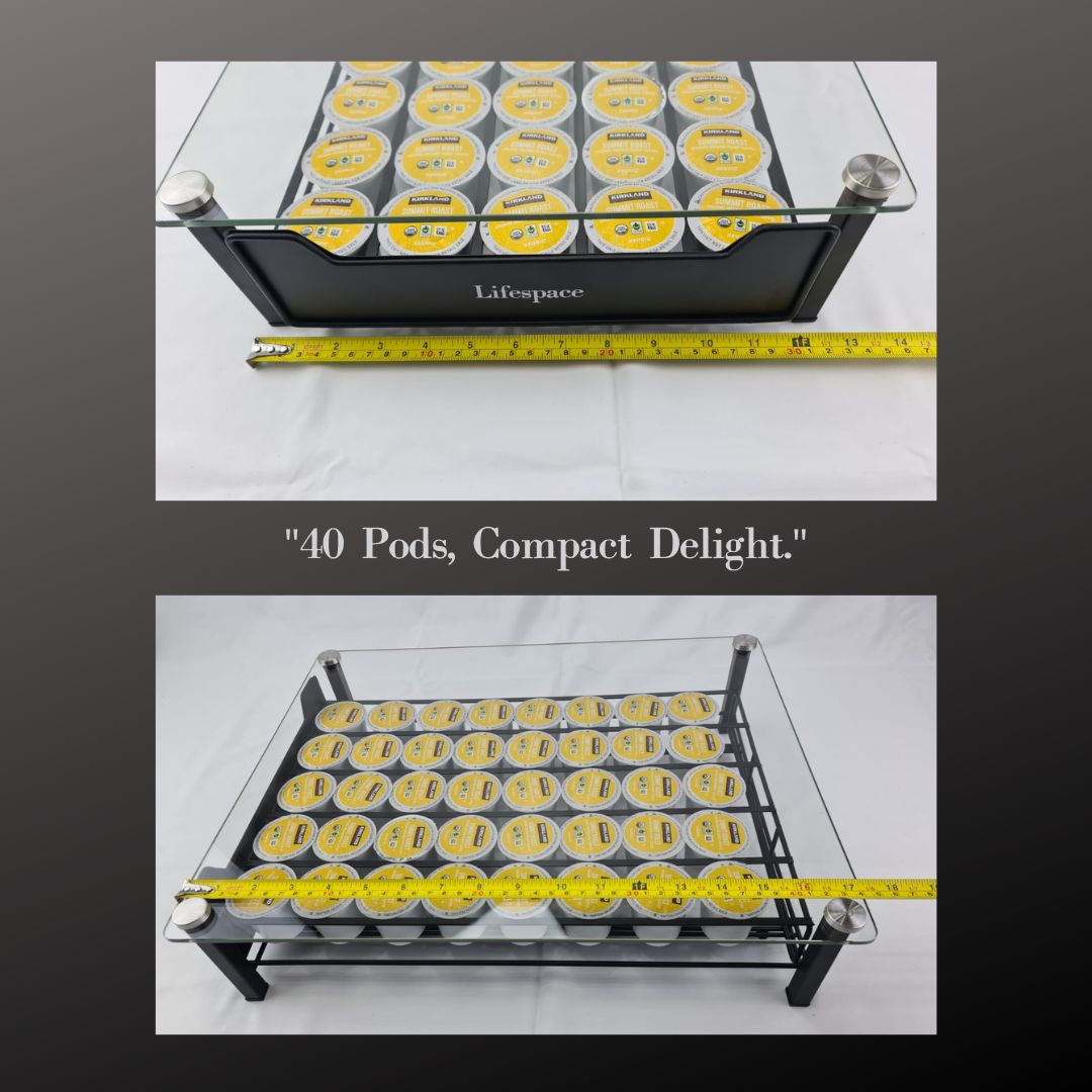 The Lifespace Glass Top 40 Pod K-Cup Coffee Pod Holder with Drawer is not just a storage accessory; it's a statement piece that elevates your coffee-drinking experience. Start your day right with a clutter-free and organized coffee station. Grab your favorite K-Cup pod with ease, and savor every moment of your coffee break.