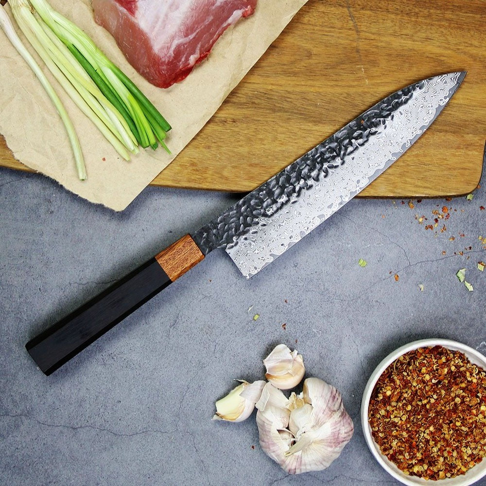 Superior Craftsmanship - Handcrafted by skilled Japanese blacksmiths, the blade is constructed using VG10 67-layer Damascus steel, forged to perfection. This exceptional material composition ensures long-lasting durability and creates an eye-catching Damascus pattern that exudes elegance.