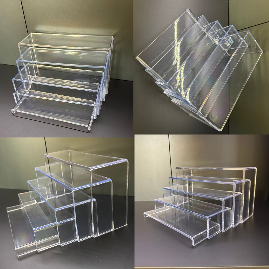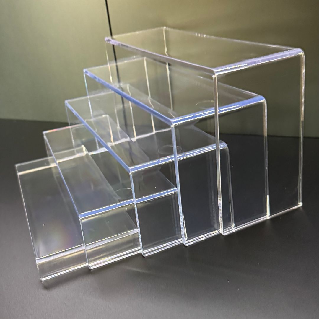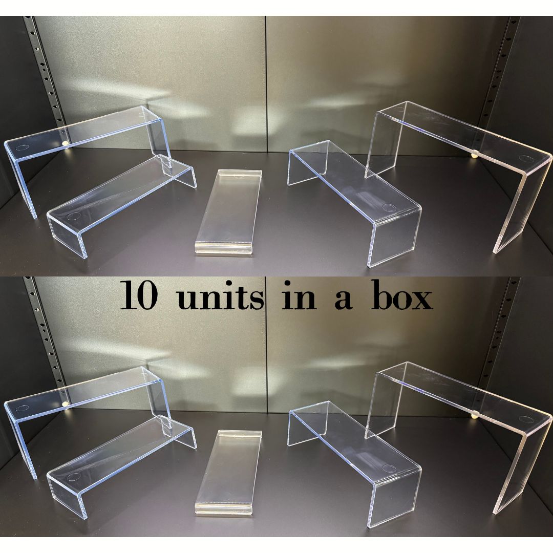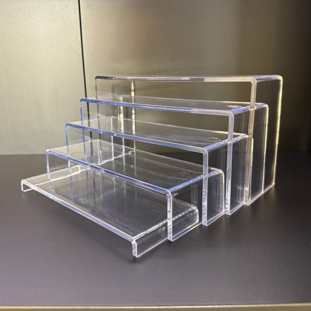 Versatile Display Tiers - Five sizes (9.2x3x5in, 8.8x3x3.9in, 8.4x3x2.8in, 8x3x1.7in, 7.6x3x0.6in), two pieces each. Perfect for arranging Lifespace knives in varied, eye-catching retail displays.