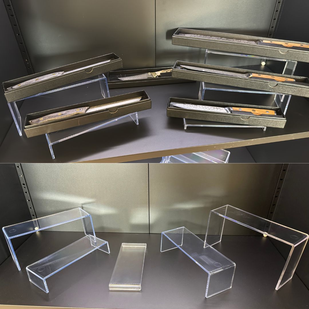 10 x clear acrylic risers (two per size), 1 cleaning cloth. Ready to elevate your Lifespace knife display.
