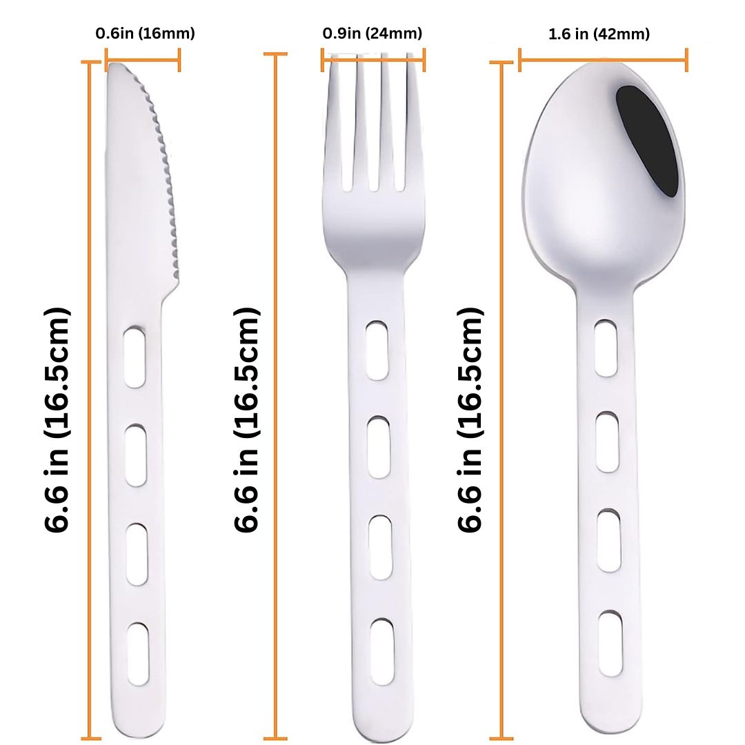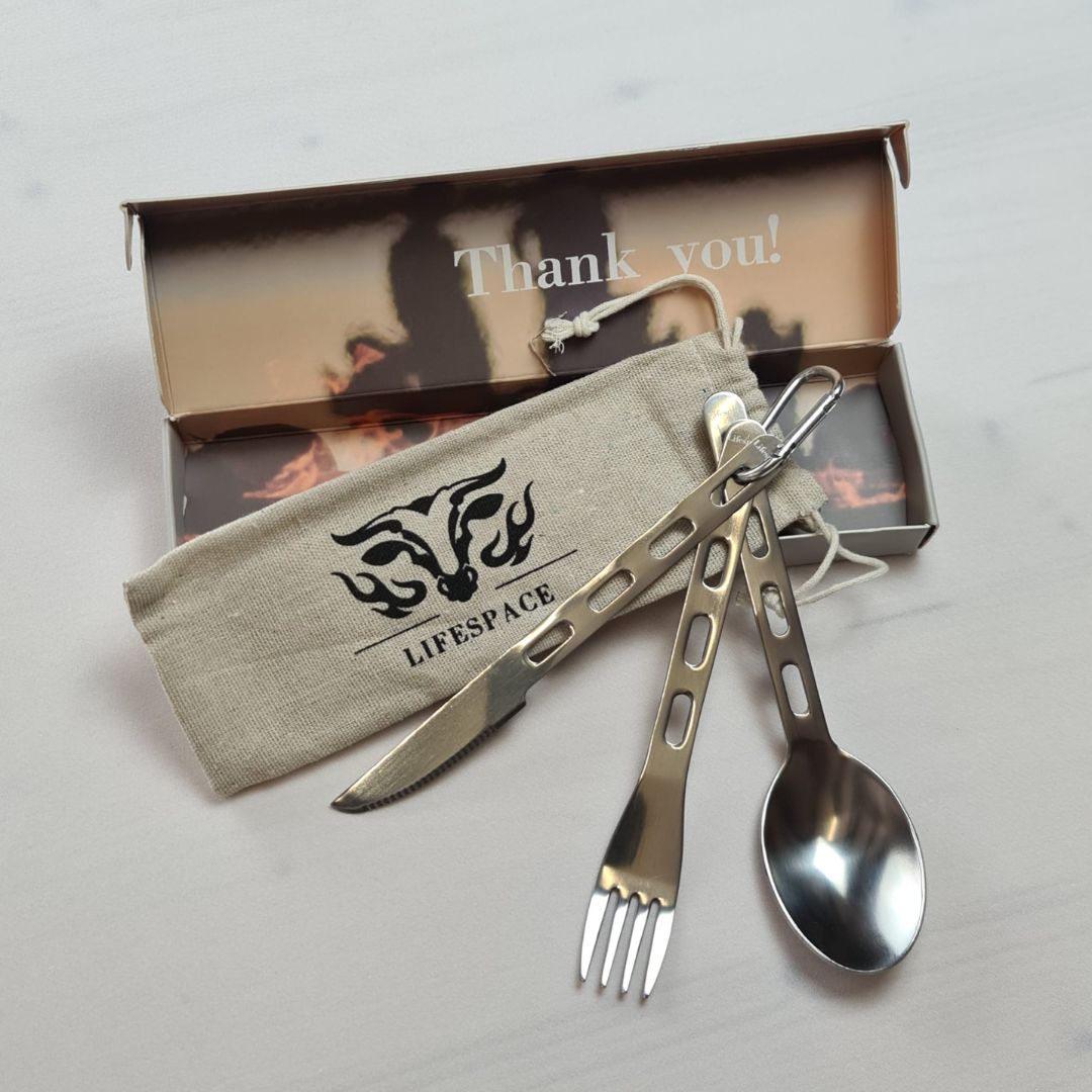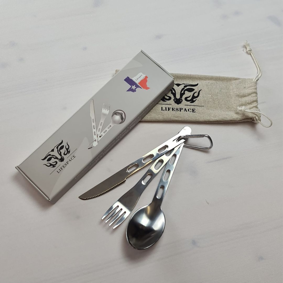 Space Saving - The Lifespace cutlery set has a flat profile with light handles that keep this cutlery set lightweight and compact. It comes with a convenient storage bag or use the carabiner for easy hanging and storage.