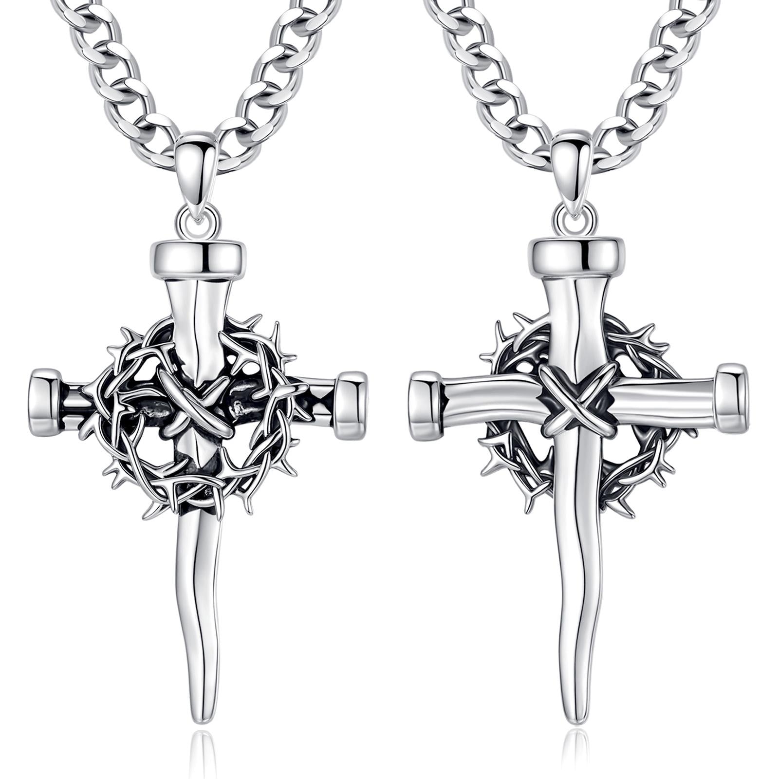 This striking silver-plated pendant is crafted in the form of a nail cross, created from three Roman-style nails and wrapped at the intersection with a detailed crown of thorns. The powerful design evokes the instruments of Christ’s Passion—the nails that pierced His hands and feet, and the thorns that mocked His kingship while crowning His suffering love.
