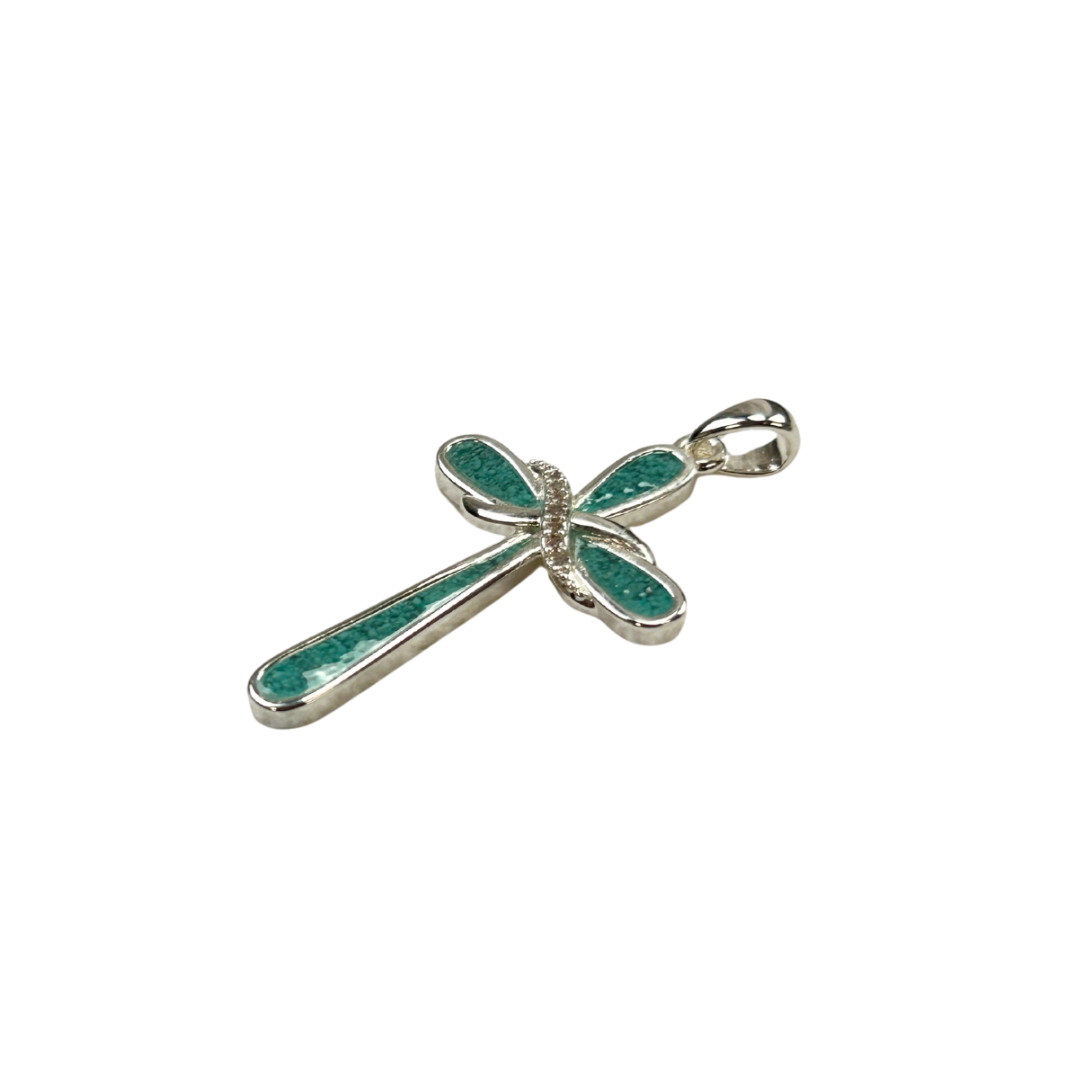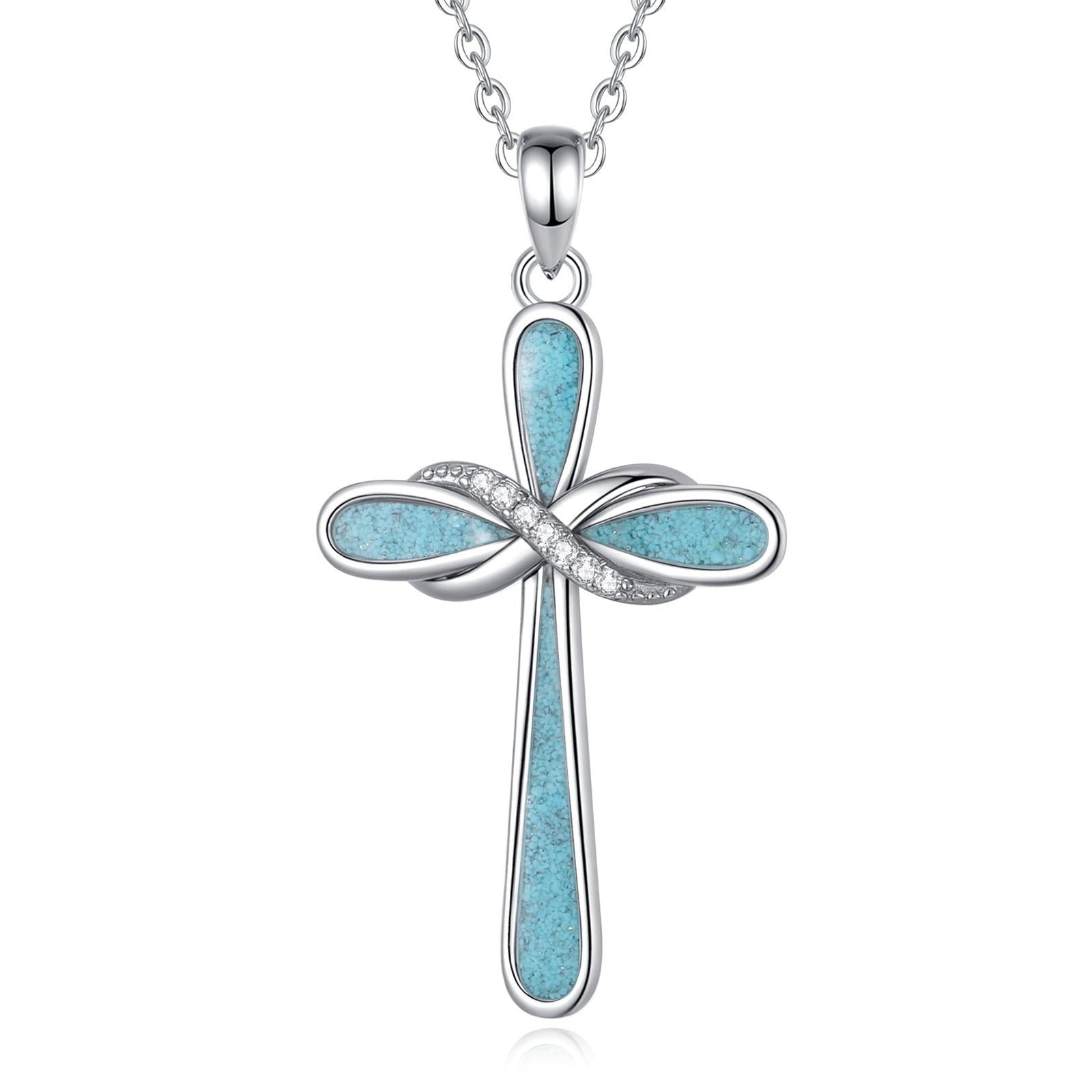 This elegant silver-plated cross pendant features flowing infinity twists at the center, accented with sparkling cubic zirconia stones that create a brilliant play of light. The cross is beautifully inlaid with chipped turquoise stone, forming a rich, textured turquoise blue that evokes serenity, protection, living water, and the heavens.
