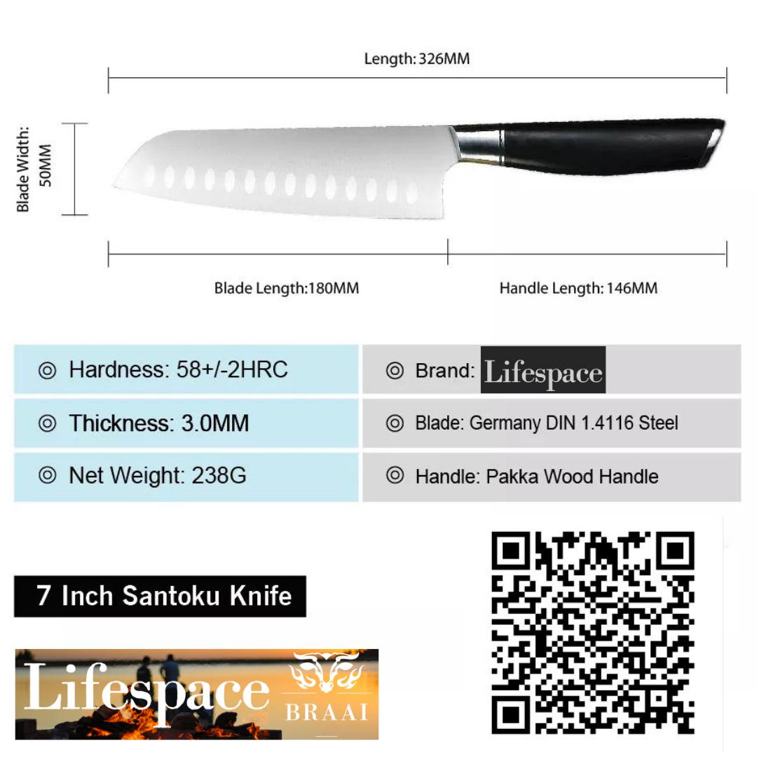 Multi-purpose Chef's Santoku Knife - A beautiful Lifespace Classic Japanese 7" Santoku knife. This professional knife is designed for chopping, mincing, dicing, slicing of vegetables, meats, fruits, and will meet most of your daily cutting or chopping requirements. It is truly an all-around cooking knife!