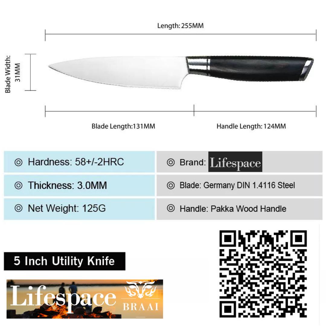 Multi-purpose Chef's Utility Knife - A beautiful Lifespace Classic Japanese 5" (blade) Utility knife. This professional knife is designed as the ultimate utility knife for dicing, slicing of vegetables, trimming meats, fruits, and will meet most of your daily cutting requirements. It is truly an all-around chef’s utility knife!
