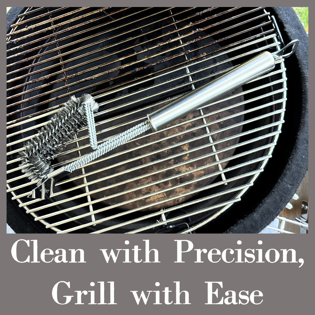 Effortless Cleaning: Designed with three rows of robust stainless-steel bristles, this brush strikes the perfect balance between stiffness and flexibility. It’s neither too rigid to cause scratches nor too soft to flatten over time. A simple twist allows for 360° cleaning, effectively removing stubborn stains from every corner and edge of your grill—not just the top. Paired with a sharp, solid scraper, it significantly reduces your cleaning time, making quick and thorough cleaning a reality.