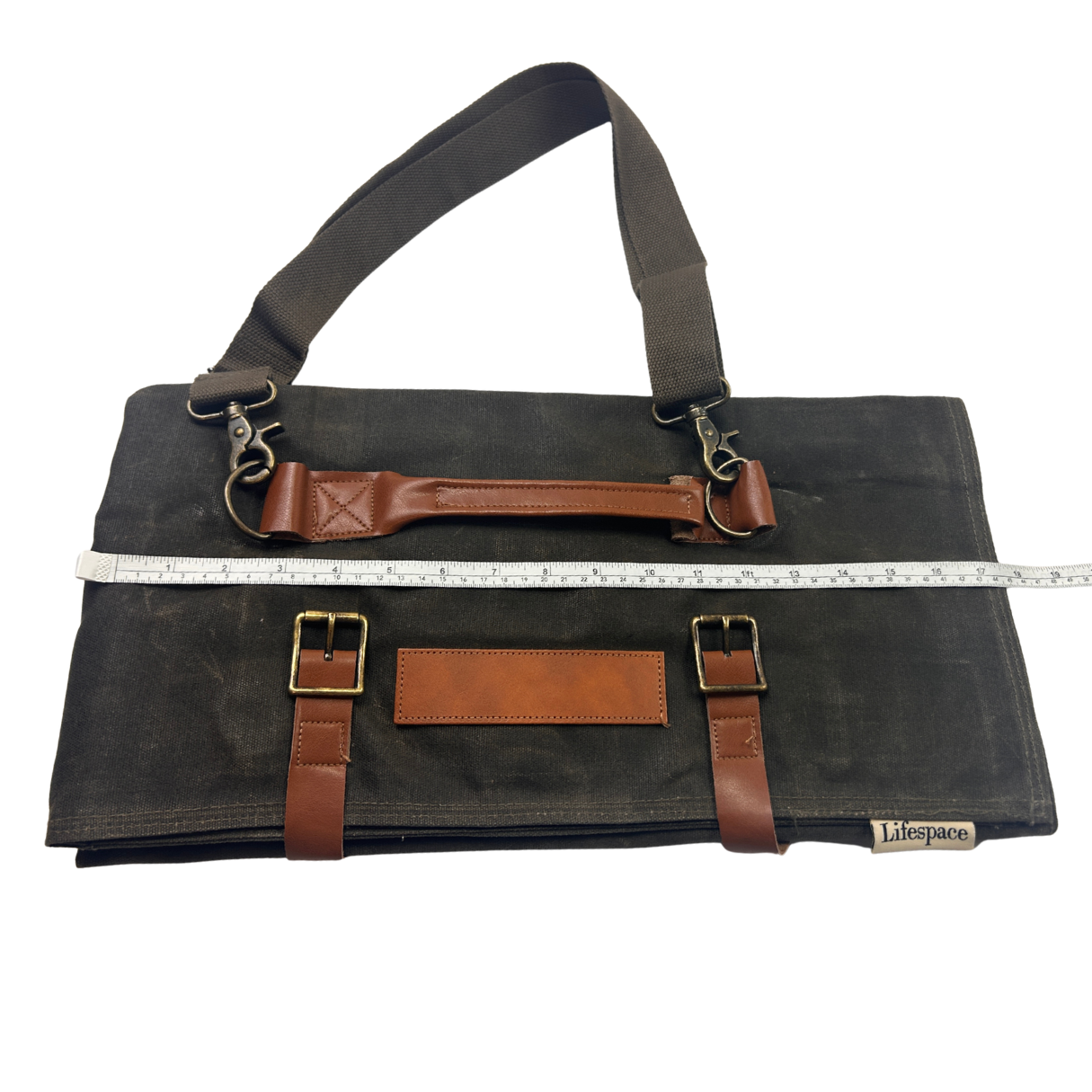 Introducing the Lifespace Premium Leather and Canvas Knife Roll, a meticulously crafted storage solution for your kitchen knives and utensils: